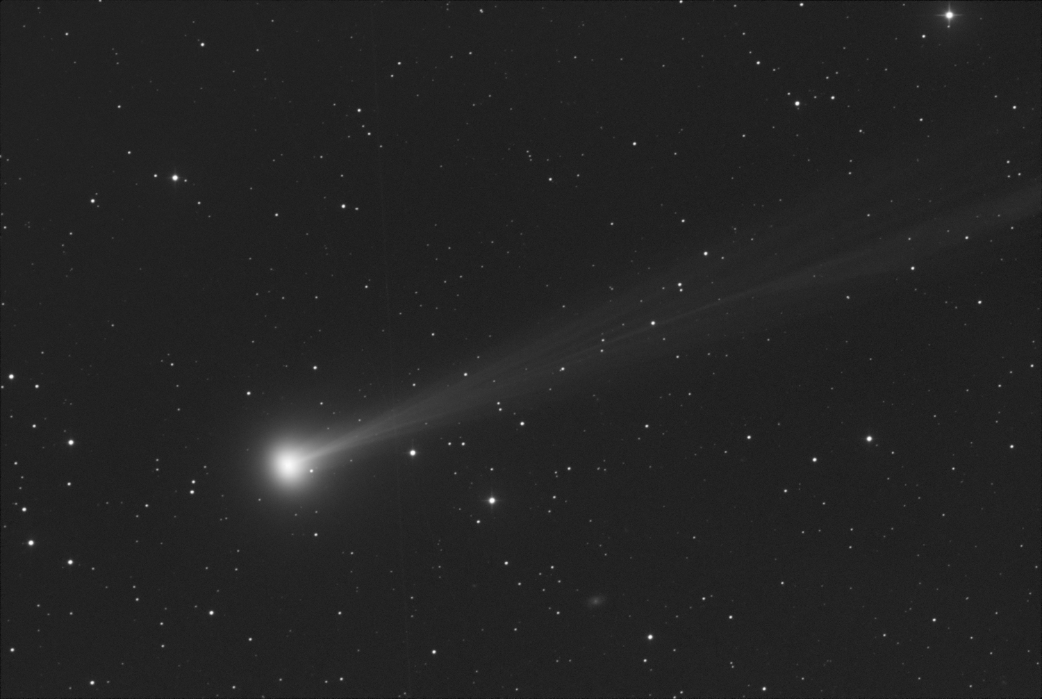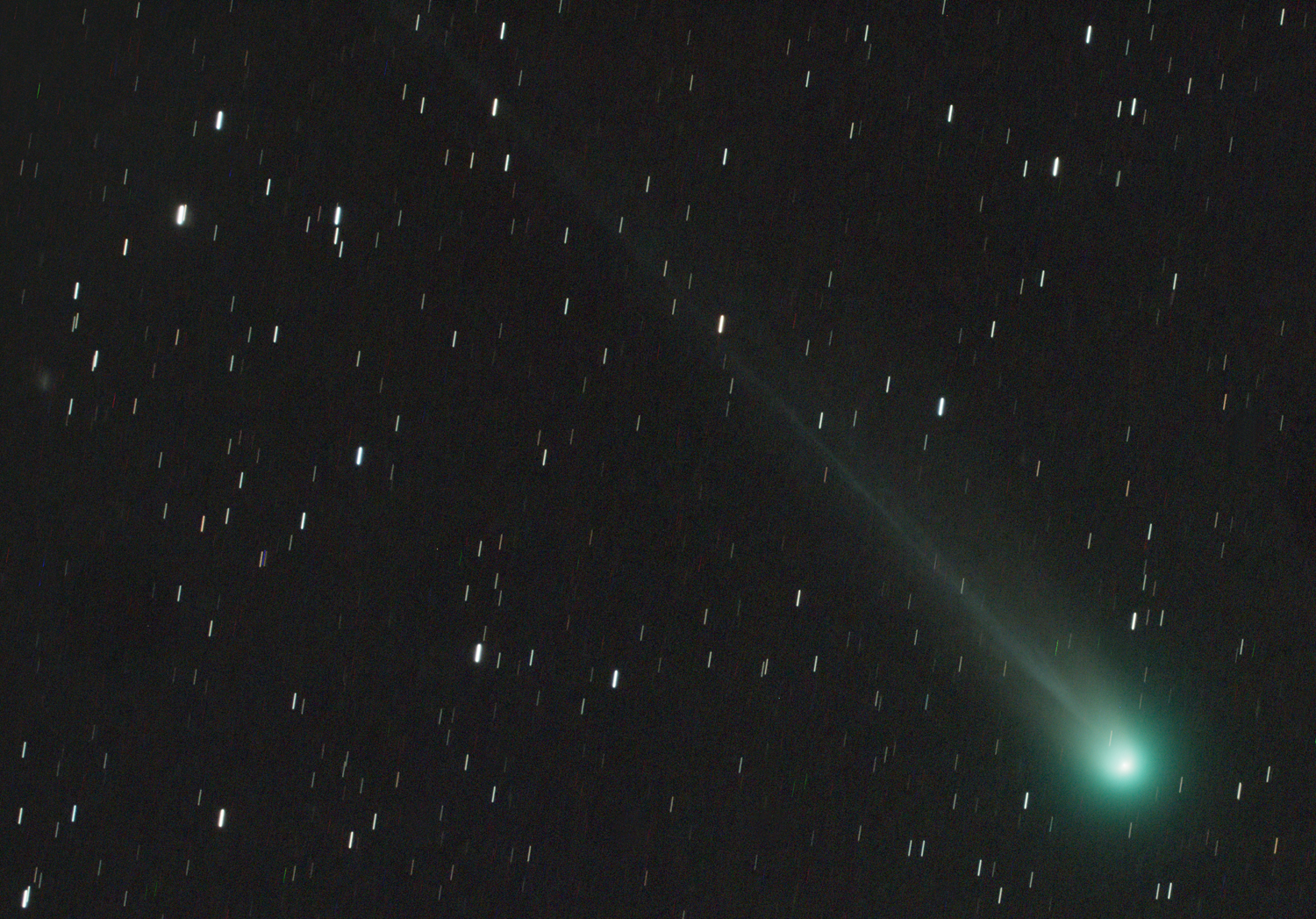 Komet Lovejoy (C/2014 Q2), langperiodischer Komet, der nach ca. 11.000 Jahren wiederkehren wird, mit ganz feinem Schweif (Größenordnung am Himmel: ähnlich wie Andromeda-Galaxie)