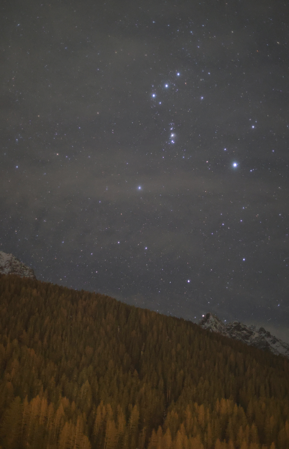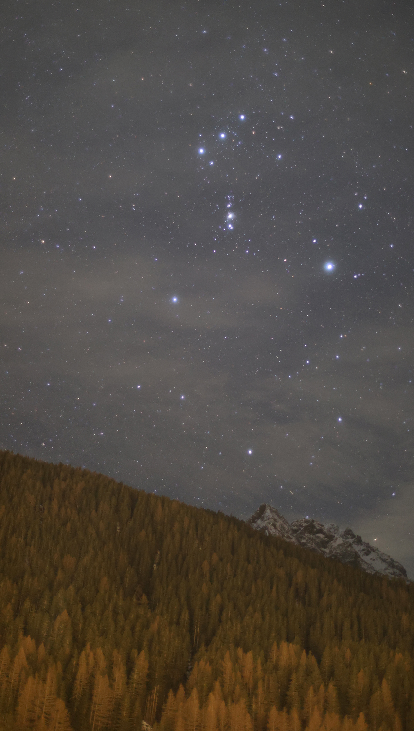 Das Sternbild Orion ist ein markantes Sternbild, das am Himmelsäquator liegt. Es ist weltweit Mitte Dezember gut zu sehen, weil sich die Sonne dann auf der Gegenseite des Sternenhimmels befindet. Das Sternbild hat zwei Sterne erster Größe. Die drei Sterne zweiter Größe Alnitak (Zeta Orionis) Mintaka (Delta Orionis) und Alnilam (Epsilon Orionis) stellen den Gürtel des Orion dar. Das Sternbild enthält ein ausgedehntes Sternentstehungsgebiet, dessen auffälligste Komponente der mit bloßem Auge sichtbare Orionnebel ist. Bei dieser Aufnahme wurde ein sehr lichtstarkes RF-Objektiv am Alpenhimmel getestet.