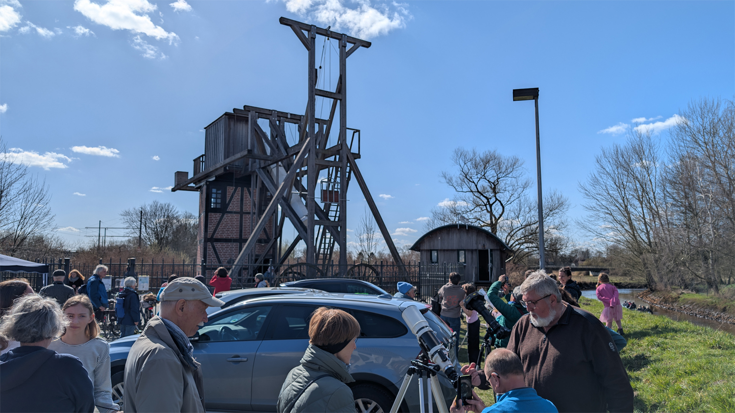 Endlich mal wieder eine Sonnenfinsternis zu Hause, wenn auch nur partiell. Dieses Mal lud die AVL zum Telescopium nach Lilienthal ein, um mit dem Gerät sowie vereinseigenen Teleskopen die Sonnenfinsternis zu beobachten. Und es kamen ca. 100 Besucher nach Lilienthal und machten von dem Angebot gebrauch. Das Wetter zeigte sich ebenfalls von seiner besten Seite. Es war ein rundum gelungener Event.