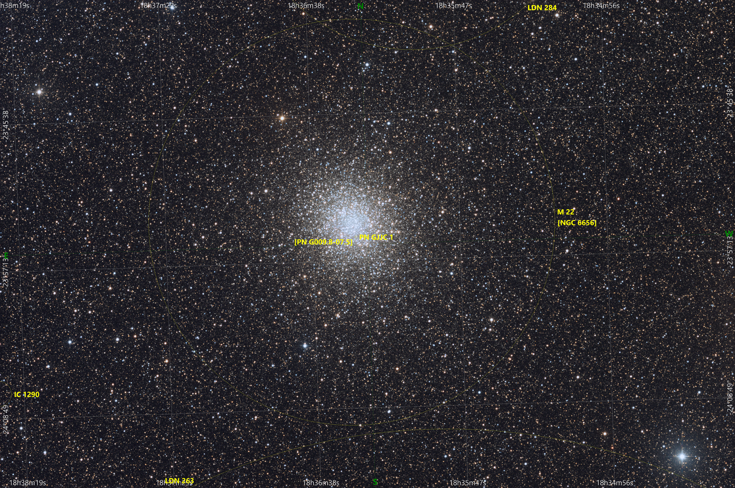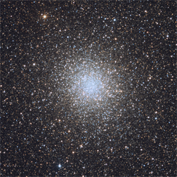 Der Kugelsternhaufen M14 (NGC 6402) ist mit über einer Millionen Sonnenmassen zwar der schwerste, aber auch der lichtschwächste der fünf Kugelsternhaufen des Sternbilds Schlangenträger. M14 wurde 1764 von Charles Messier entdeckt.