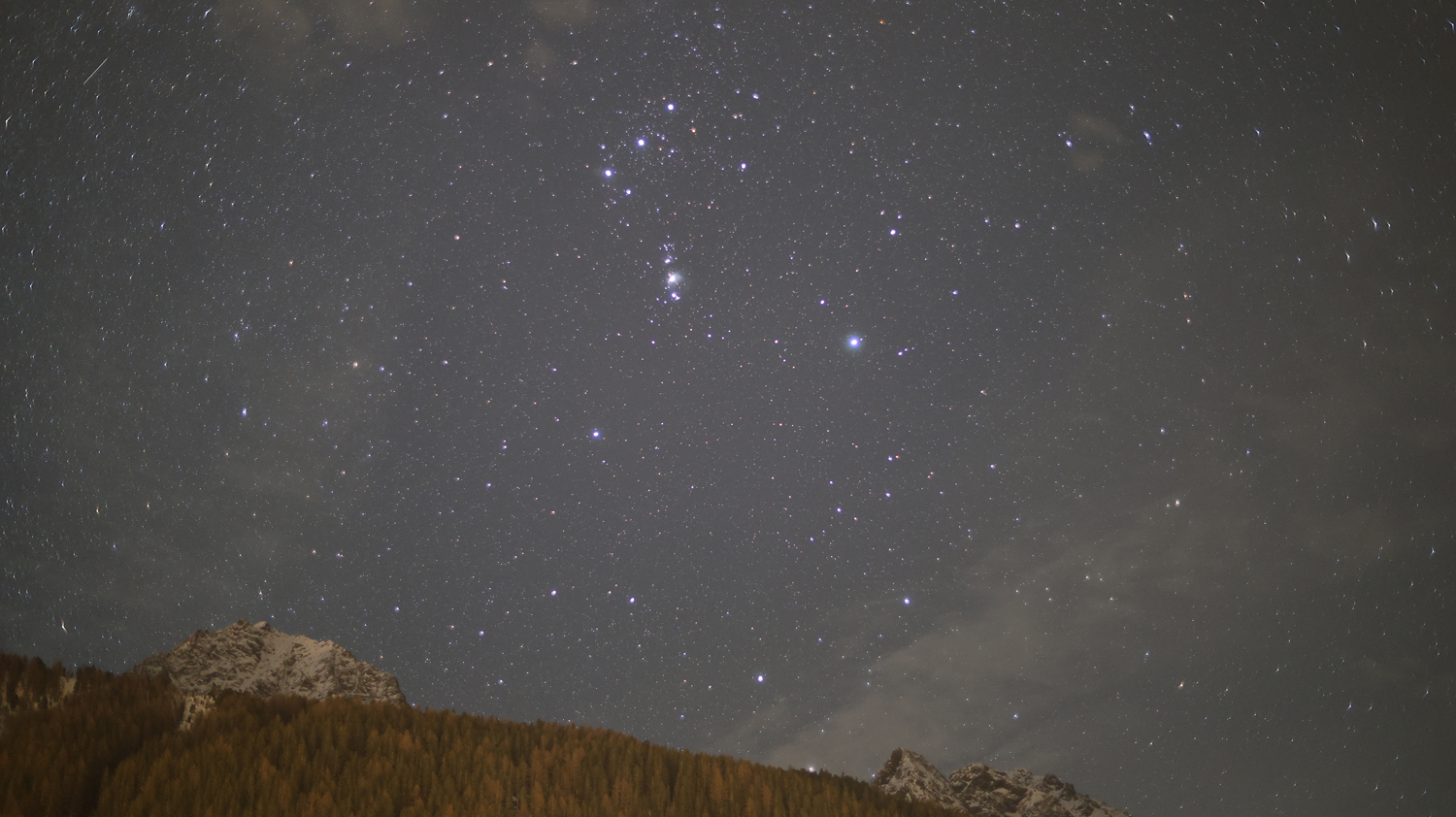 Strichspur-Aufnahme der Milchstraße in den Alpen mit aufgehendem Jupiter (links unten am Bildrand).