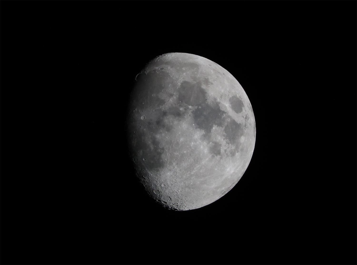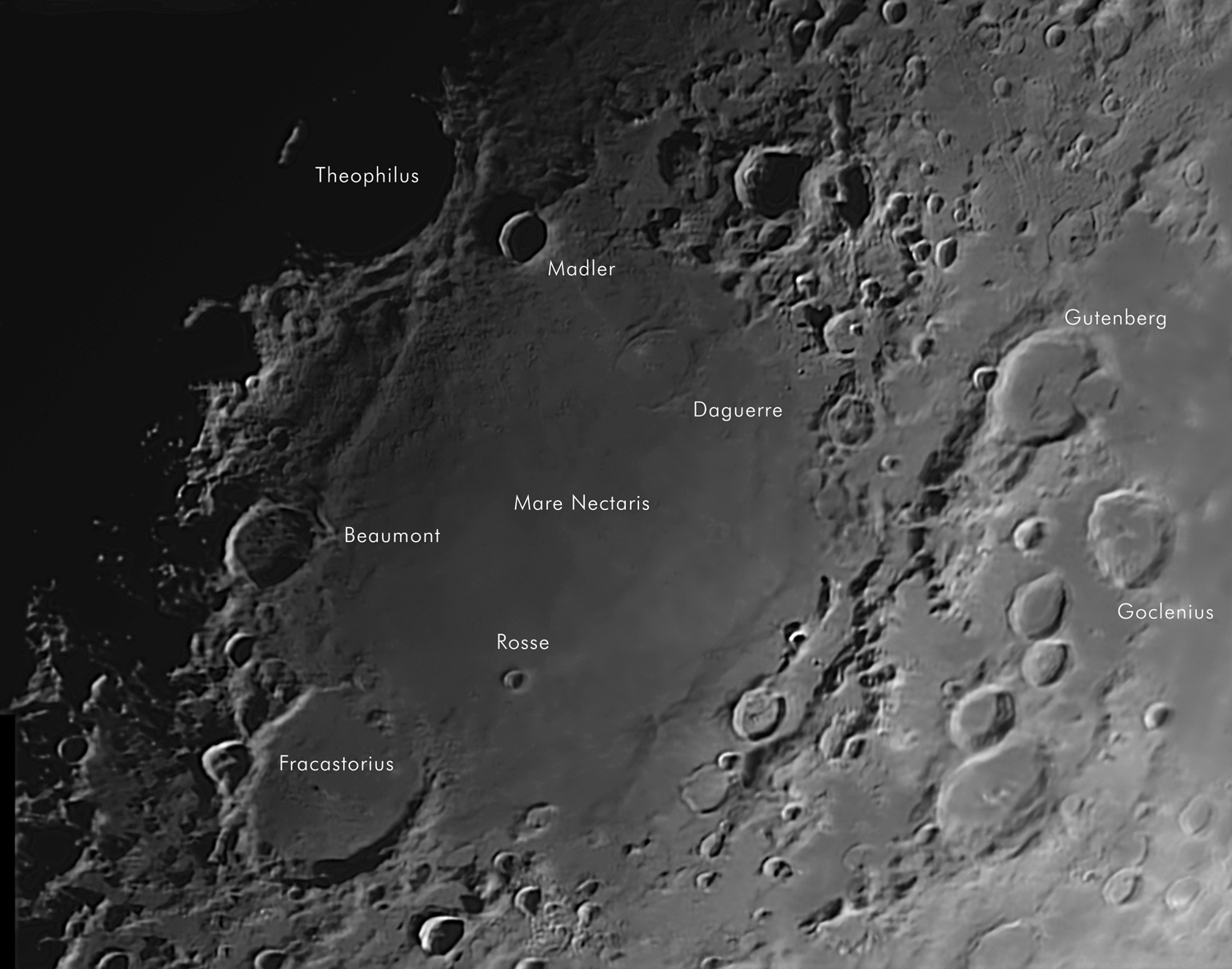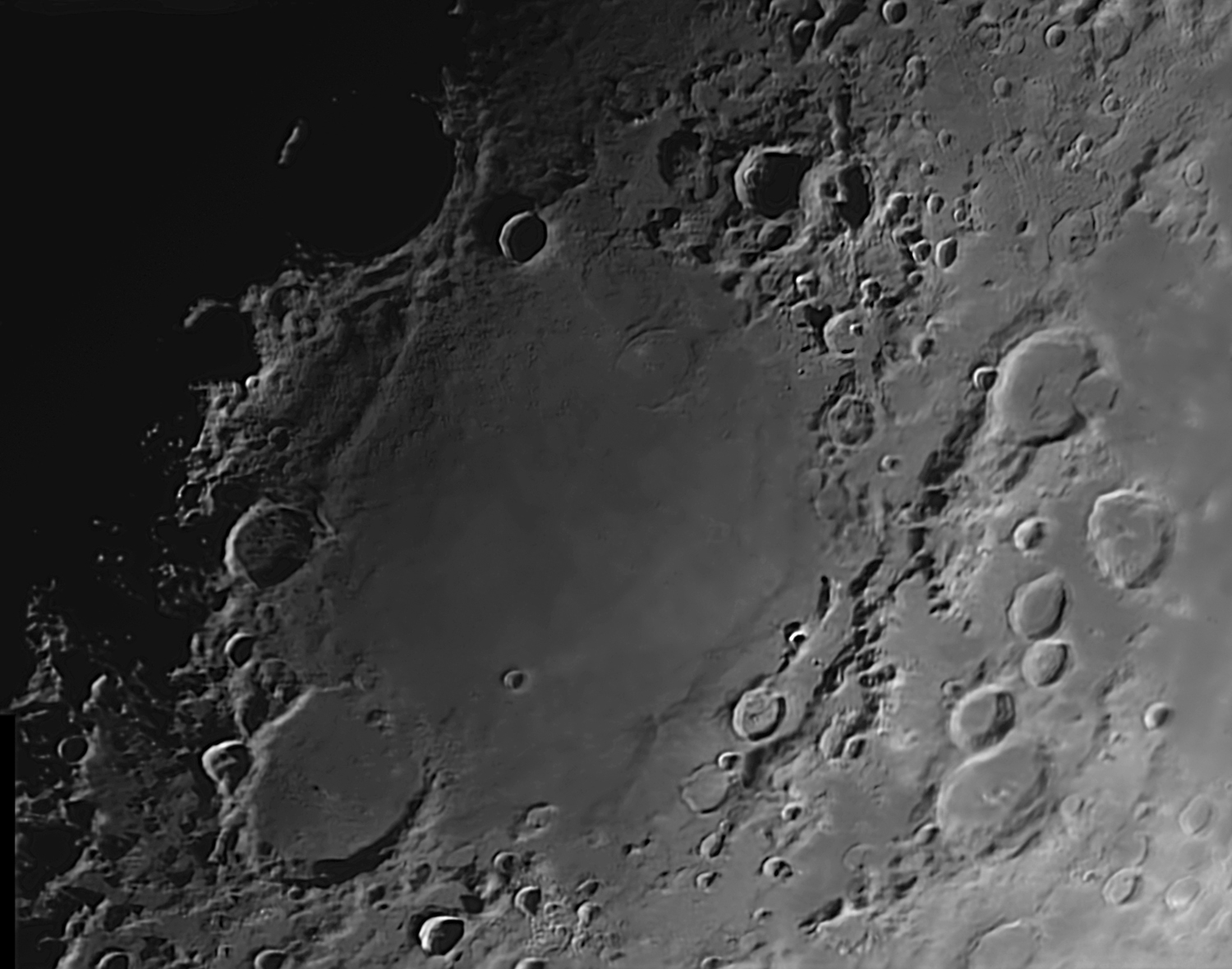Mare Serenitates, zunehmender Mond (6. größtes Mondmeer, faltiger Bergrücken im Osten).