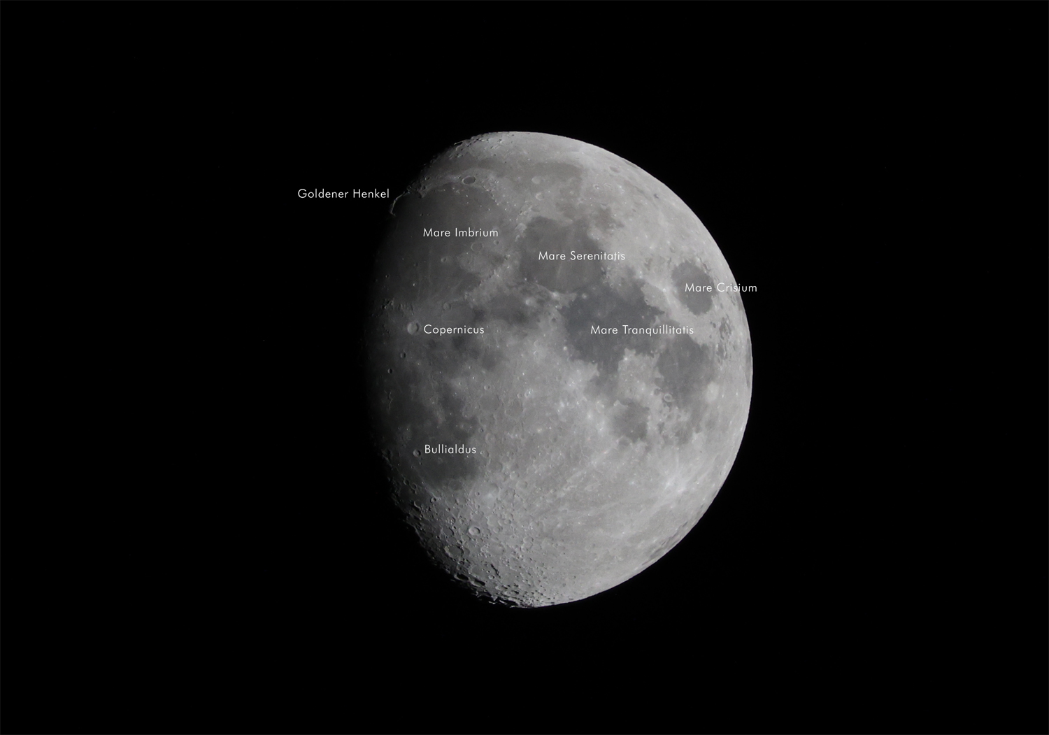 Der Mond ist das auffälligste Gestirn an unserem Nachthimmel. Er bietet bereits ohne Hilfsmittel mannigfaltige Entdeckungsmöglichkeiten an. Dementsprechend ist er auch meistens das erste Objekt, welches von einem Teleskop- oder Fernglas-Besitzer aufgesucht wird. Seine Umlaufzeit um die Erde beträgt nicht ganz einen Monat - nämlich 27,32 Tage, wobei er ca. 1 km/sec zurücklegt. Von der Erde ist der Mond, bezogen auf seine große Halbachse, 384.400 km entfernt. Der Mond umläuft zusammen mit der Erde die Sonne, durch die Bewegung um die Erde pendelt der Mond jedoch um eine gemeinsame Ellipsenbahn. Die Variation der Gravitation während dieser Pendelbewegung führt zusammen mit geringeren Störungen durch die anderen Planeten zu Abweichungen von einer exakten Keplerellipse um die Erde. Das Aussehen des Mondes variiert im Laufe seines Bahnumlaufs und durchläuft die folgenden Mondphasen: Neumond, zunehmender Mond, Vollmond, abnehmender Mond und Halbmond. Diese Reihenfolge wird aus Sicht der nördlichen Erdhalbkugel so eingehalten. Die nicht von der Sonne beleuchteten Teile der erdzugewandten Mondseite sind dabei nie völlig dunkel, sondern werden durch das Erdlicht - den Widerschein der Erdoberfläche und der Erdatmosphäre - ein wenig aufgehellt. Diese Aufhellung wird als Erdschein oder auch als aschgraues Mondlicht bezeichnet und ist am besten bei schmaler Mondsichel zu sehen. Die ständig erdabgewandte Rückseite des Mondes ist ebenfalls nicht immer dunkel, sondern unterliegt dem entsprechend versetzten Phasenwechsel - bei Neumond wird sie vom Sonnenlicht vollständig beschienen.