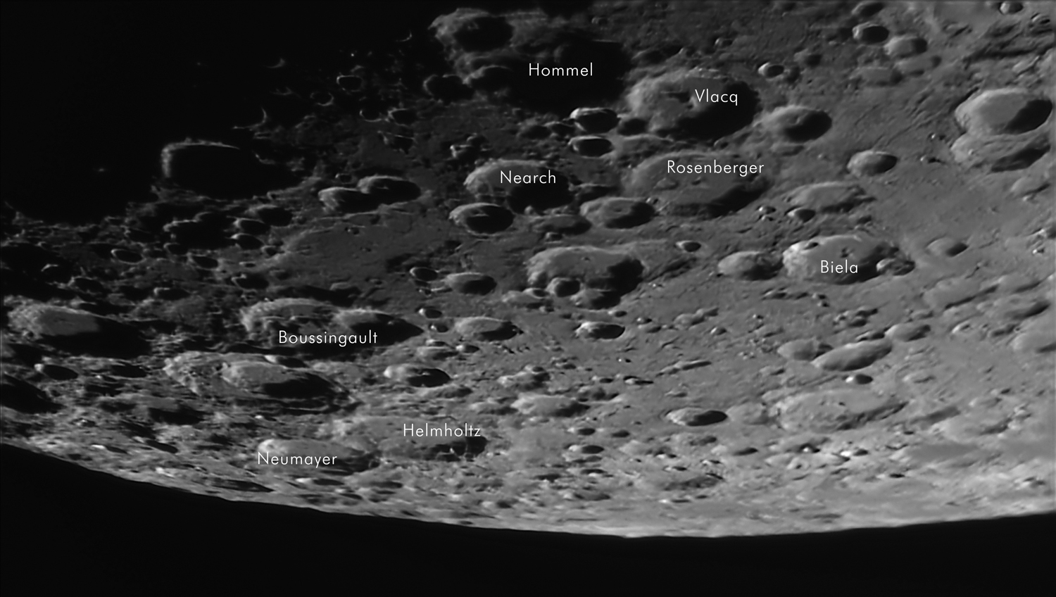 Babbage-, Herschel-, Anaximander-, Carpenter-, Anaximenes-, Philolaus-, Anaxagoras- und Goldschmidt-Krater (von links nach rechts).
