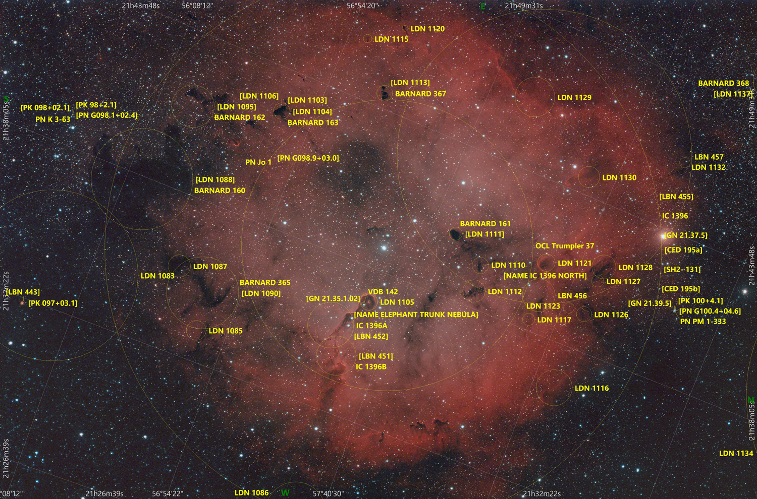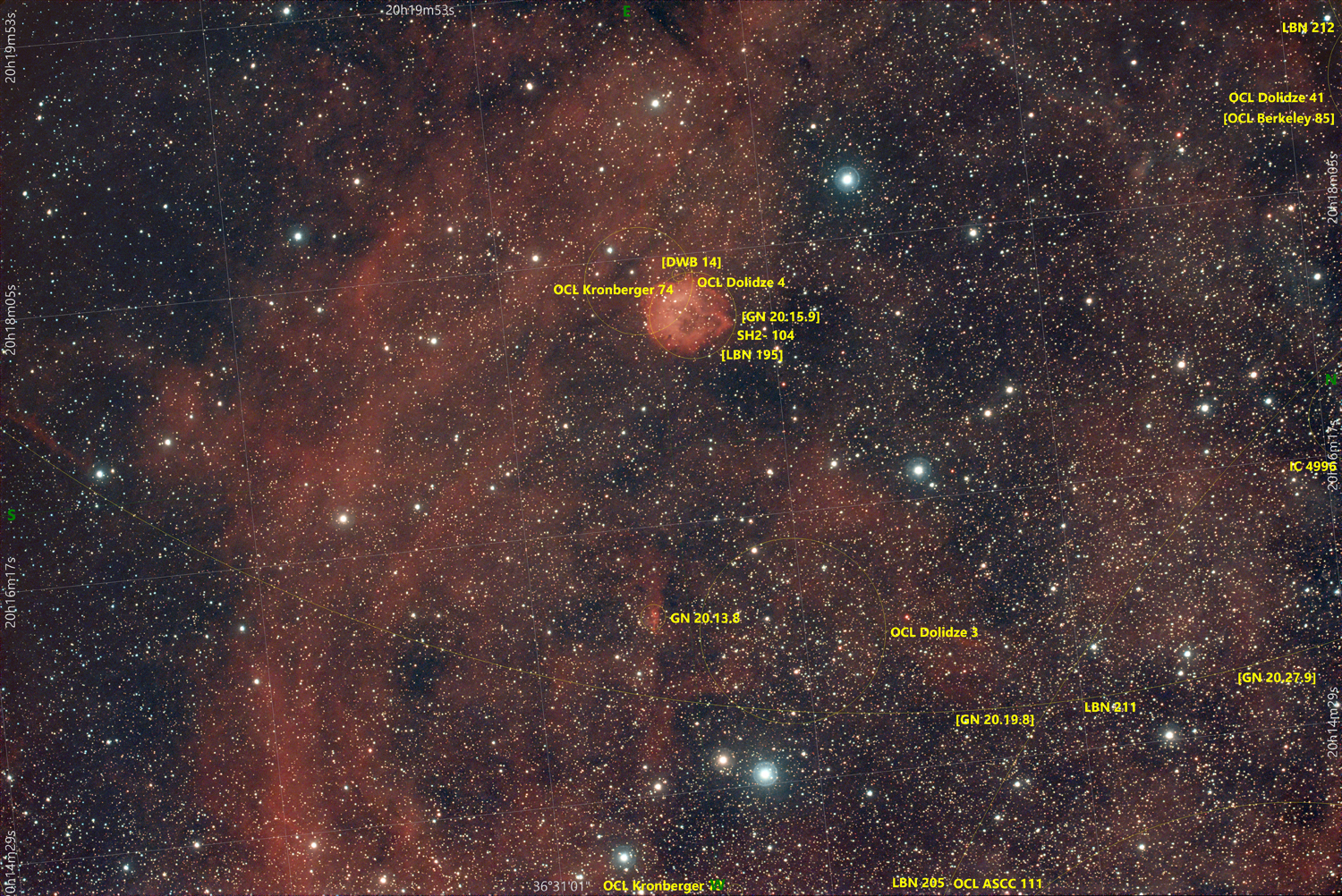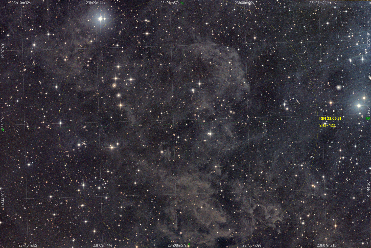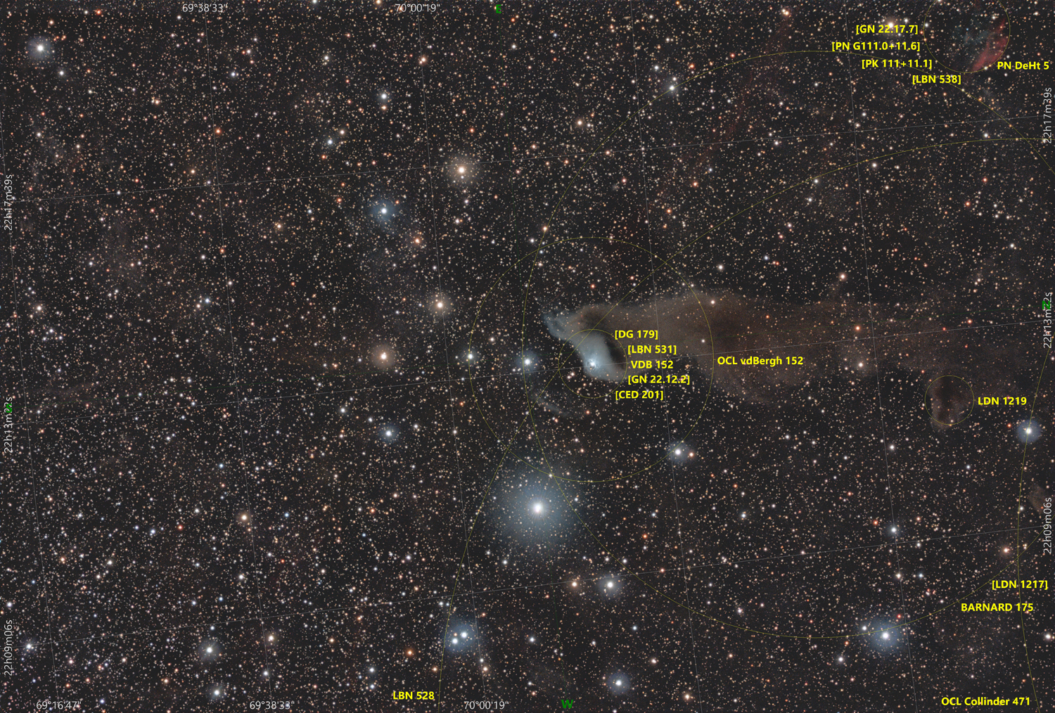 Bubblenebel (NGC 7635), Emissionsnebel und eine HII-Region im Sternbild Kassiopeia, mit offenem Sternhaufen M52 (oben) und dem diffusen Nebel NGC 7538 (unten).