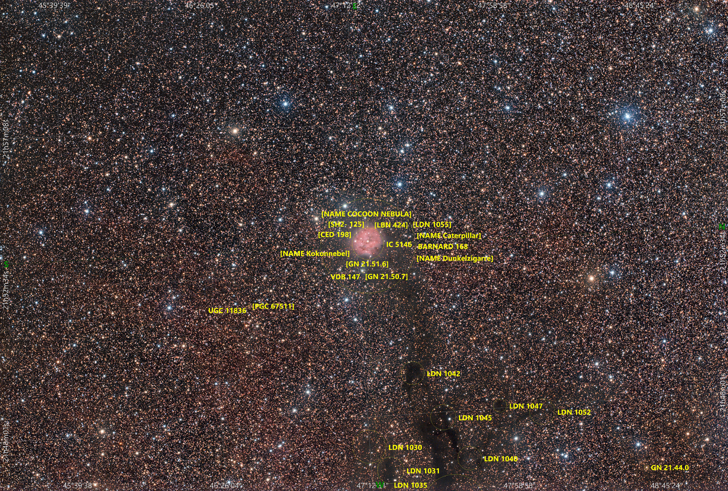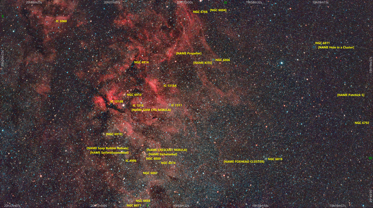 Schmetterlingsnebel IC 1318 (Gamma-Cygni-Nebel), Emissionsnebel und HII-Gebiet im Sternbild Schwan.