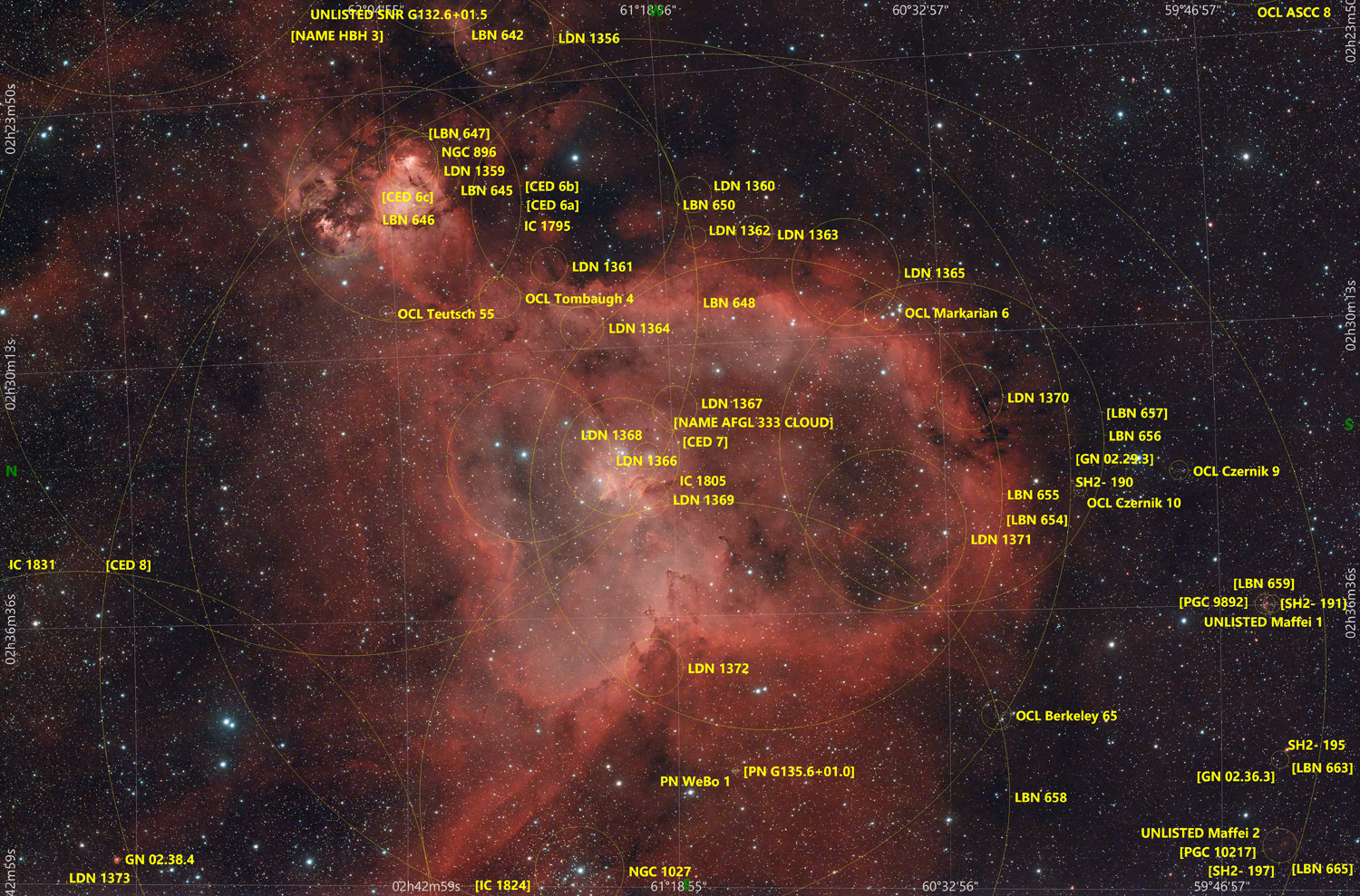 IC 1848 - Seelen- oder Embryonebel: Emissionsnebel im Sternbild Cassiopeia, mit IC 1805 auch Herz- und Seelennebel genannt.