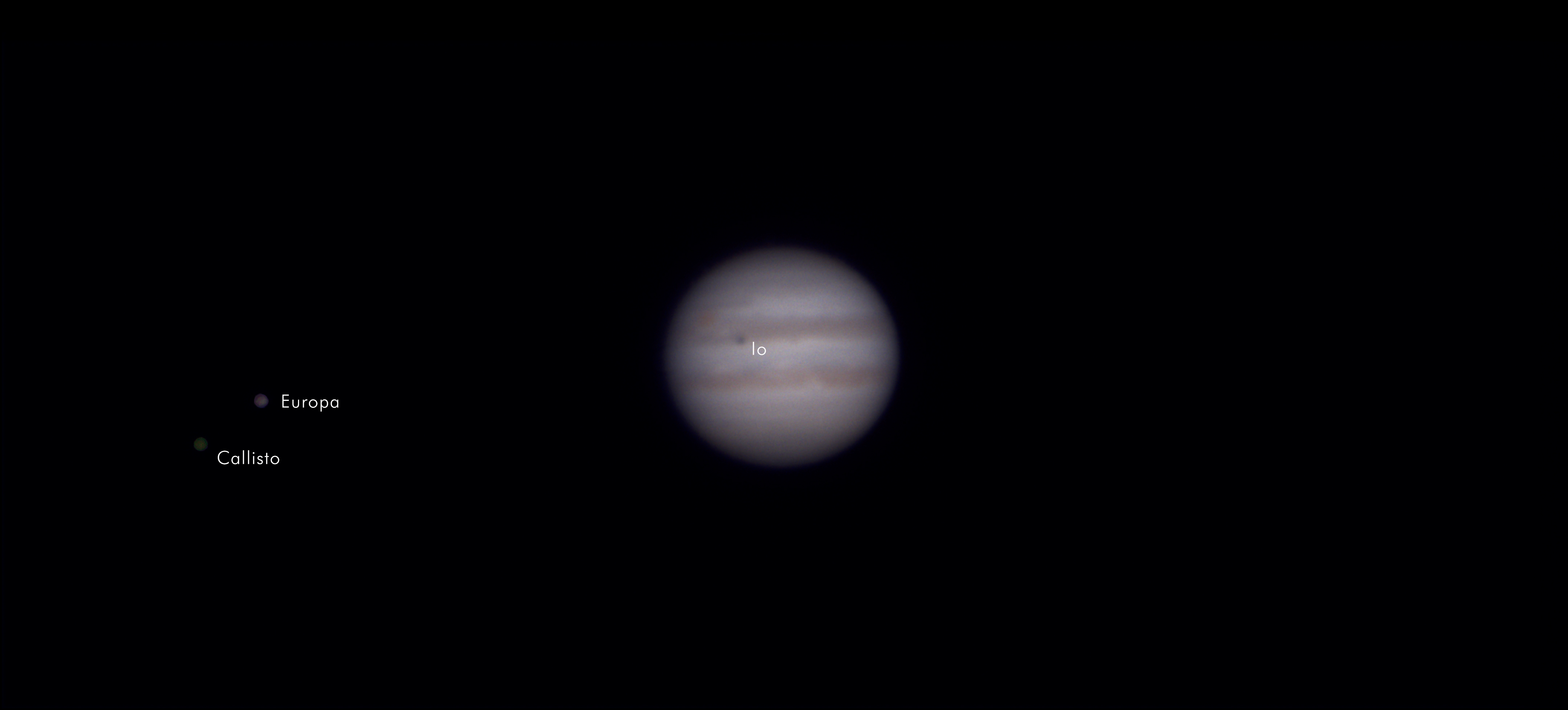 Jupiter, 5. Planet unseres Sonnensystems, 778 Mio. km Sonnenentfernung, mit zwei seiner Monde