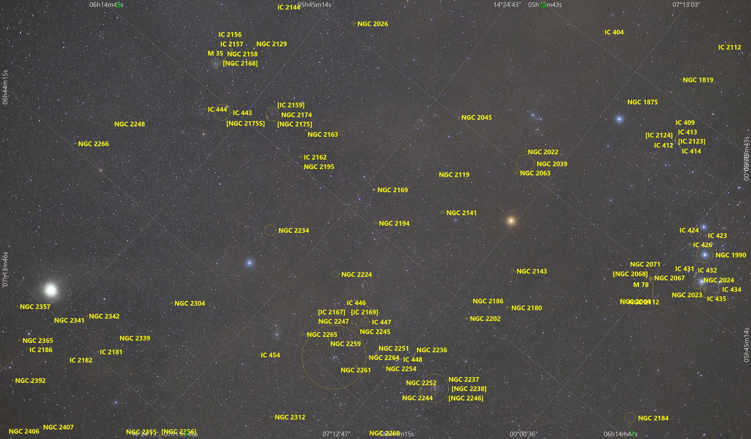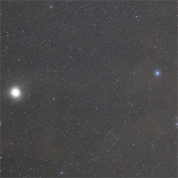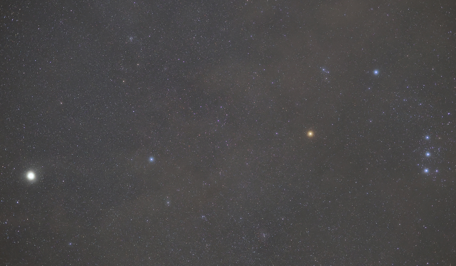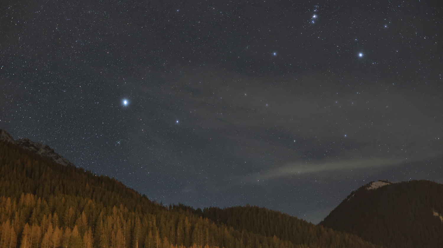 Capella ist der Hauptstern im Sternbild Fuhrmann und ist mit 0,1 mag der dritthellste Stern am Nordhimmel. Beteigeuze ist hingegen ein Stern im Sternbild des Orion. Er ist ein zur Milchstraße gehörender Riesenstern und wird im Hertzsprung-Russell-Diagramm der Klasse der Roten Überriesen zugerechnet. Die Sternenregion von Capella und Beteigeuze wurde in einer Einzelaufnahme mit sehr hoher Lichtstärke in den Alpen in 1.600 m Höhe fotografiert. Die gelbe Färbung von Beteigeuze kommt sehr schön heraus, während Capella der größte und auffälligste weiße Stern auf dieser Aufnahme ist. Zwischen den beiden Sternen befindet sich Elnath und rechts neben Beteigeuze kann man Bellatrix gut erkennen. Darunter befinden sich die Gürtelsterne Alnitak, Alnilam und Mintaka des Orion. Bei der kurzen Belichtung lassen sich sogar schon Nebel im Hintergrund erahnen.