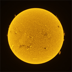 Bei der Fotografie der Sonne geht es hauptsächlich darum die Sonnenflecken im Bild festzuhalten. Wesentlich mehr Details lassen sich dabei im H-Alpha-Licht feststellen, da dann auch die Strukturen der Oberfläche und Protuberanzen sichtbar werden. Die Sonnenflecken treten im Übrigen nicht immer in gleicher Anzahl auf. Es existieren Minimum- und Maxima-Zeiten, in denen sich die Aktivitäten komplett beruhigen oder zu ihrer vollen Stärke aufbauen. Dies hat wiederum Einfluss auf die Erde, trotz der relativ großen Entfernung zwischen beiden Objekten. Die Sonne ermöglicht das Hobby der Astronomie auch am Tag auszuführen, da man heute als Amateurastronom die Möglichkeiten hat die Sonne im Weiß-, H-Alpha- und Calcium-Licht zu betrachten. So ergeben sich unterschiedliche Einblicke auf die Sonnenoberfläche, Sonnenflecken und Flares, die sich immer wieder schnell ändern können.